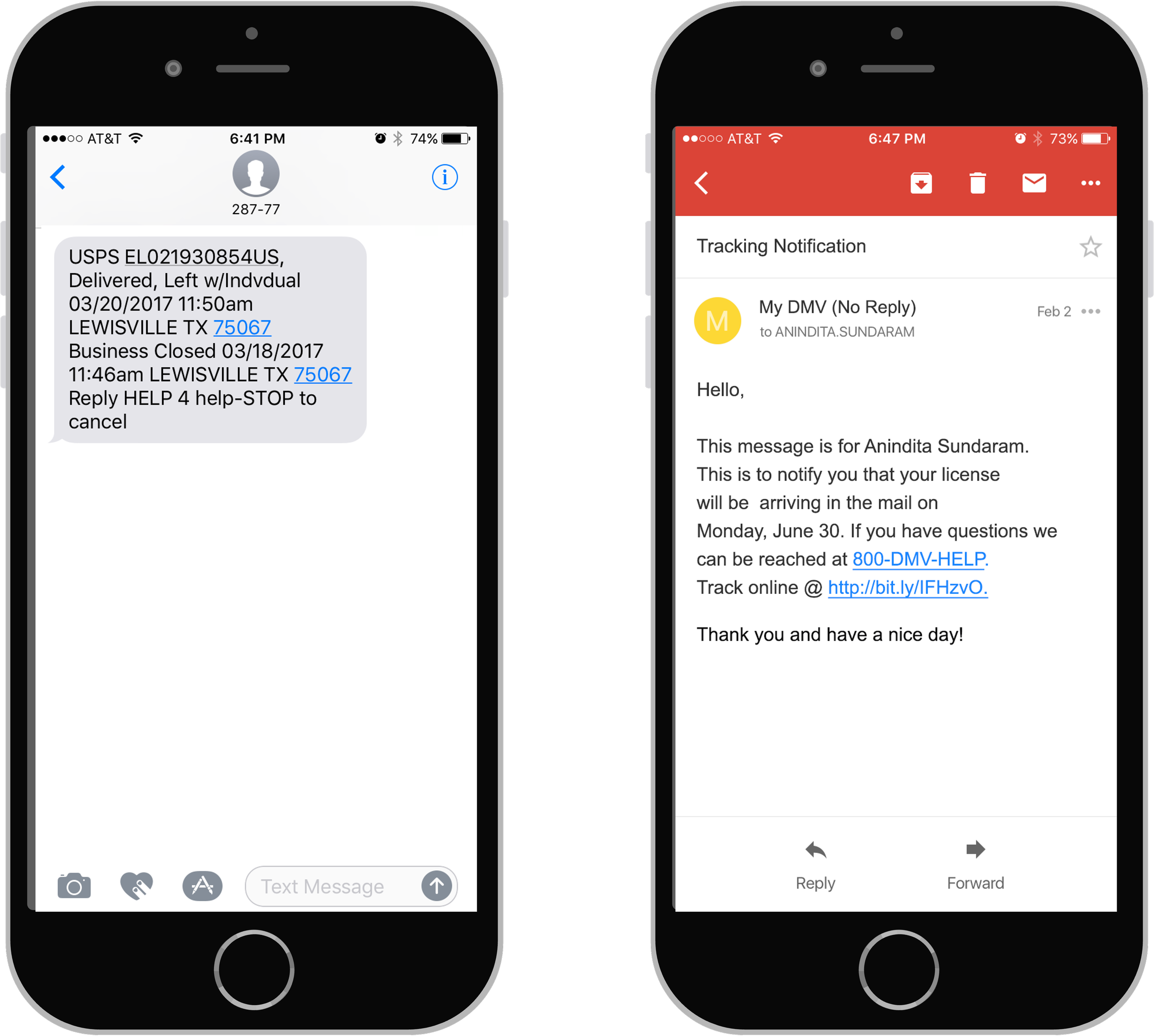 Receive tracking notification via text or email for status check on transactions, providing clarity for improved customer service.