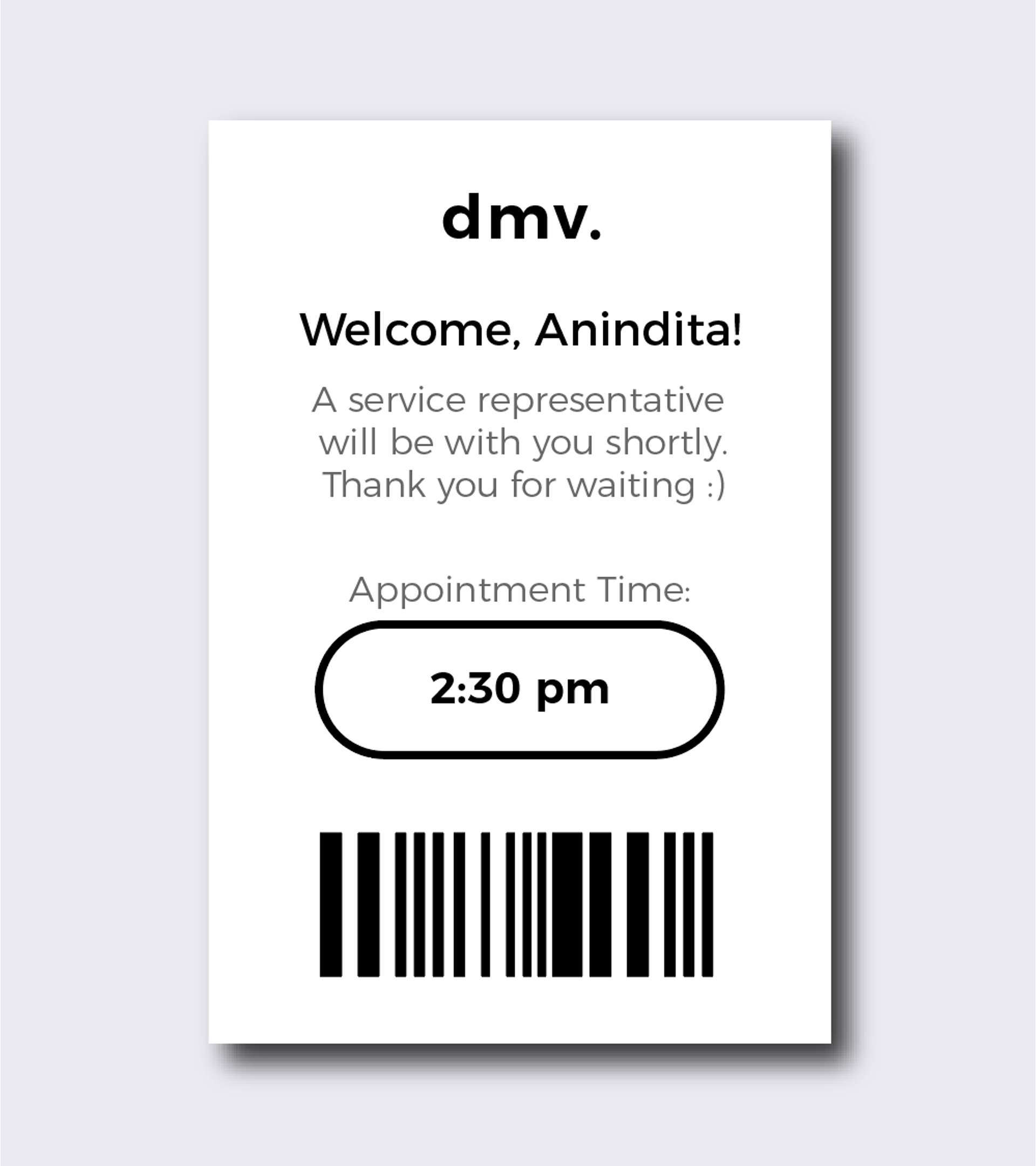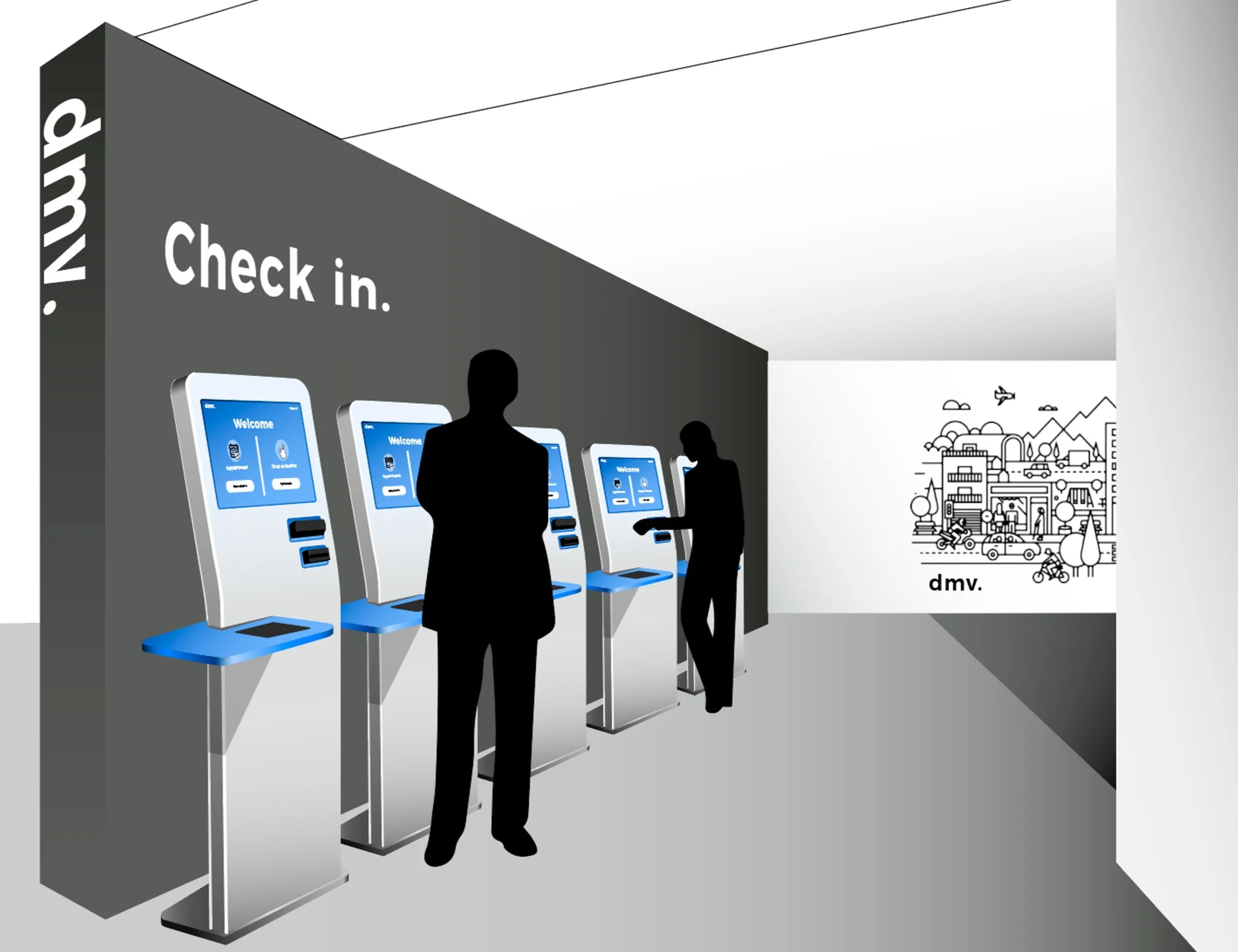 Greeted at the DMV by a helpful representative. Presented at the entrance with easy to use kiosks to check in for appointments, book appointments for drop ins, or complete service for simple transactions. Support staff stand-by for assistance.
